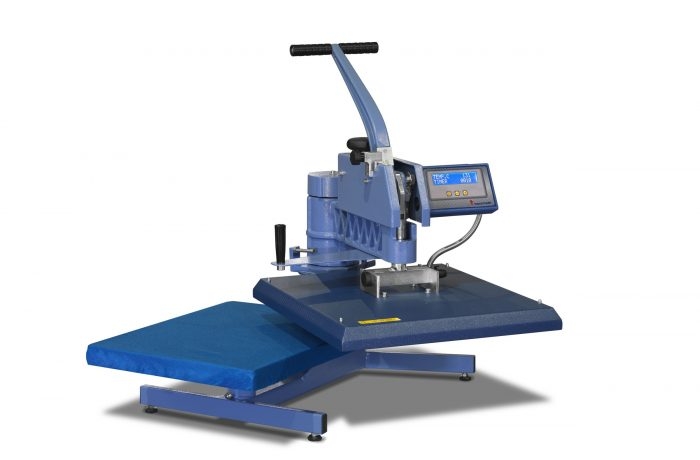 Prensa en caliente de funcionamiento manual con apertura lateral. Placa térmica superior inclinable para obtener una presión constante entre las dos placas. Regulación electrónica de tiempo y temperatura. La placa inferior es intercambiable. Opción de accesorio para gorras.
