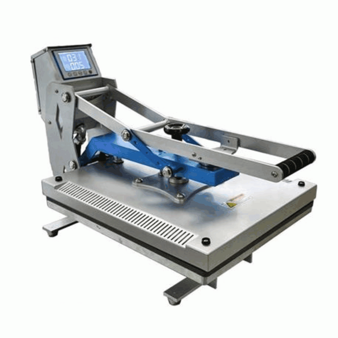 Prensa térmica para transferencia y sublimación semi- automática con plato de 50x60, de apertura automática mediante sistema electromagnético. Equipada con un sistema acústico de aviso 5 segundos antes de apertura. Plato calentador teflonado y resistencia blindada.
