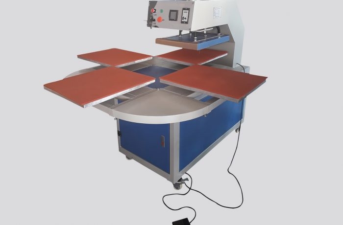 Plancha transfer sublimación neumática para uso profesional, compuesta por 4 platos de 40x50 intercambiables con carrusel giratorio. Bajada de plato y giro mediante pedal de pie para trabajar con mayor comodidad o automática. Perfecta para grandes producciones. Programador de tiempo y temperatura. Control de velocidad de carrusel. Preparada para trabajar con un solo operario, ideal para transfers o sublimación. Sistema de cambio de platos fácil y rápido, pudiendo trabajar con distintos tamaños de plato a la vez.