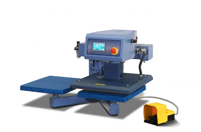 Prensa en caliente neumática con doble encimera y placa calefactora pantógrafo móvil. Regulación electrónica digital de tiempo, temperatura y presión con indicador de avería mediante pantalla táctil. Opción de accesorio para gorras.
